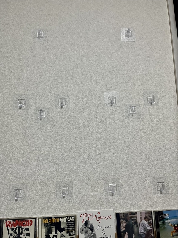 簡易レコードディスプレイの完成です。レコード壁掛けラックを買おうとすると地味にお高くつくのでこれはナイスアイディアなのでは。